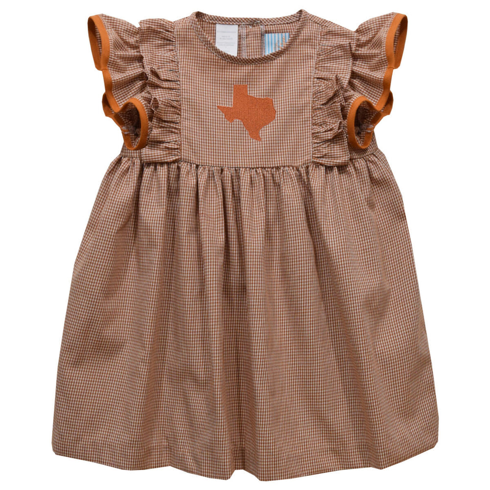 Roam the range in style with this playful Texas Embroidery Gingham Ruffle Dress. Perfect for little cowgirls, this dress features a charming gingham print and delicate ruffles, adding a touch of southern flair. Available in girls' sizes. Yee-haw!